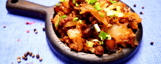 - Капусту нашинковать. Картофель очистить и нарезать кубиками примерно по 1,5-2 см. Разогреть сковороду на слабом огне, влить подсолнечное масло, затем выложить капусту, посолить и поперчить по вкусу. Жарить в течение 20 минут.