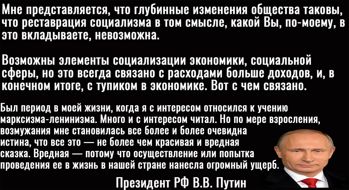 Большинство же россиян только поддержали бы такое общество, если им была бы доступна социалистическая альтернатива. Однако, представители правящего класса, которые постоянно говорят о неэффективности социализма почему-то очень сильно опасаются распространения социалистических идей в массах.