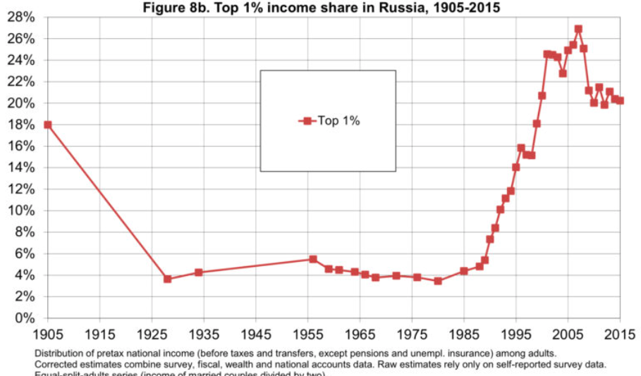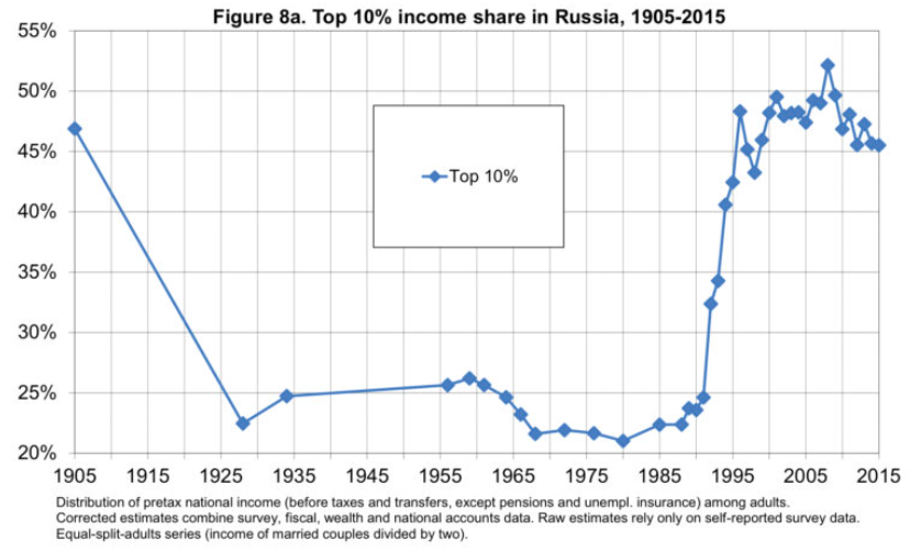 Однако крупное исследование состояния российской экономики с 1905 по 2016 годы "От Советов к олигархам", которое провели французские экономисты под руководством профессора Тома Пикетти показывает, что 10% самым богатых людей в Российской Империи принадлежало меньше национального богатства, чем современным "хозяевам жизни". Разумеется, что из-за кризиса 2014 года эта доля немного упала, но до сих пор сопоставима с царскими временами.