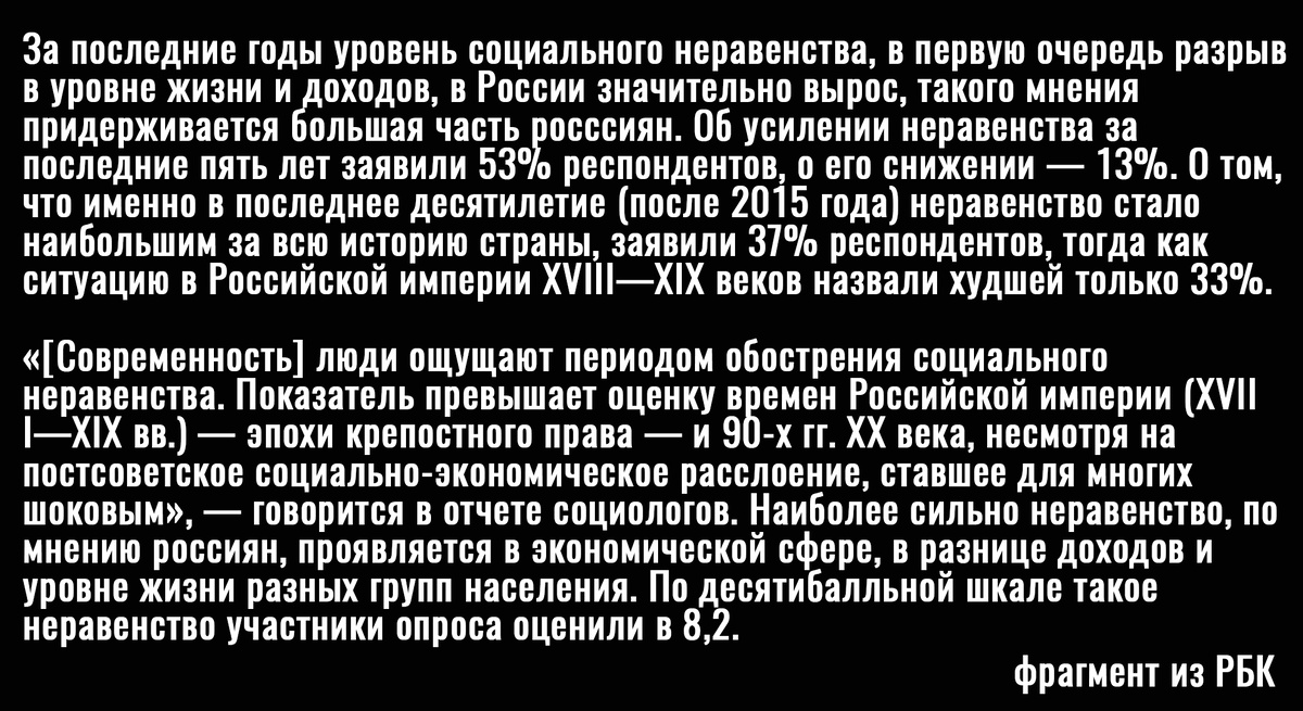 Поэтому абсолютно неудивительно, что когда ученые берутся за изучение нашего общества, собирают и аккумулируют данные от самих россиян, получается совсем не такая радужная картина, как в кремлевских кабинетах. Крупнейшее экономическое издание РБК как раз опубликовало свежее исследование отечественных социологов насчет социального неравенства в России.