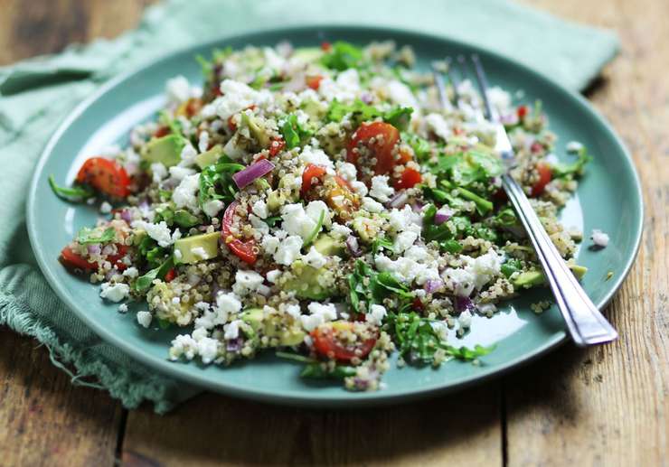 Смешайте киноа, огурец, помидор и зелень. Добавьте семена чиа, заправьте оливковым маслом и лимонным соком.