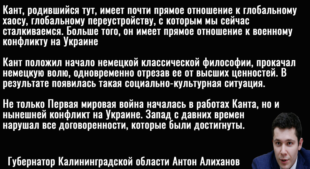 Однако нашлись в нашем Отечестве более молодые и прозорливые специалисты, которые смогли выявить ещё одного крайне опасного врага России, который продолжает ей вредить и через двести лет после своей смерти. Речь идёт о губернаторе Калининградской области Антоне Алиханове, который разоблачил великого философа, классика немецкой философии Иммануила Канта.