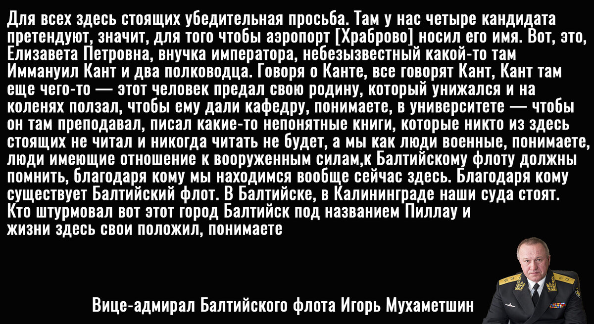 К слову, стоит отметить, что это не первая попытка атаки на Иммануила Канта. Еще в 2018 году вице-адмирал Балтийского флота Игорь Мухаметшин, выступая перед личным составом обрушился с критикой на философа. Высокопоставленный военный высказался о том, что Кант недостоин того, чтобы его имя носил местный аэропорт, так как писал какие-то непонятные книжки, которые никто не читал и читать не будет, и, вообще, был немцем.