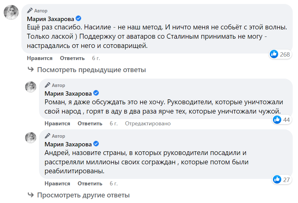 Первая, к слову, будучи сотрудницей МИДа как-то договорилась в социальных сетях до абсолютно не просто антикоммунистических, но русофобских вещей в духе самой махровой западной пропаганды. Как можно видеть, тут и про миллионы невинно репрессированных большевиками, и о том, что Сталин хуже Гитлера и всё в этом духе. Не напоминают ли такие рассуждения тексты с пропагандистских листовок Третьего Рейха, которые они сбрасывали на советских солдат?