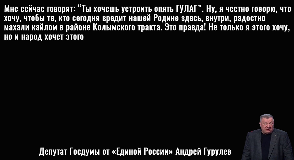 Здесь хотелось бы сделать пару замечаний: 1) Система лагерей ГУЛАГа была вынужденной необходимостью в конкретных исторических условиях начала XX века для защиты социалистического строя, так как после Гражданской войны с стране оставалось много антисоветского элемента. 2) Так как в России капитализм, то Гурулев явно планирует использовать систему ГУЛАГа не для борьбы с ростовщиками, кулаками и прочими реакционными элементами. Под "врагами", как мы уже поняли, он понимает всех, кто не является лояльным отечественным начальникам.
