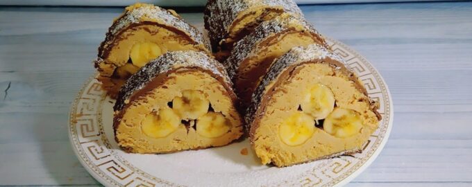 Убираем в холодильник до полного охлаждения рулета на всю ночь или на 3-4 часа. - Обмазываем растопленным шоколадом, можно украсить кокосовой стружкой или печеньем, либо полить белым шоколадом поверх черного тонкой линией.