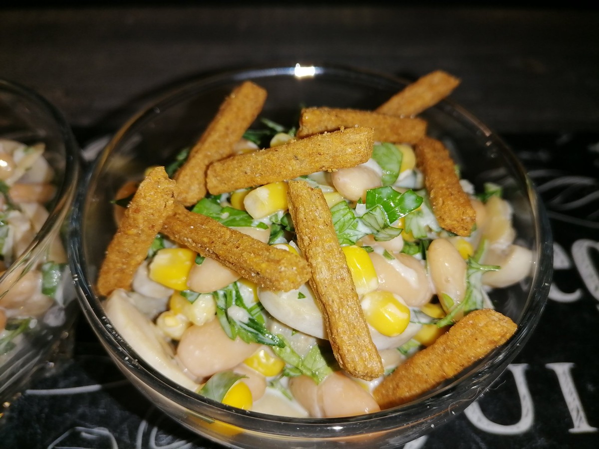 С баночек фасоли и кукурузы слить жидкости и перемешать их. Добавить измельченный чеснок, заправить майонезом.