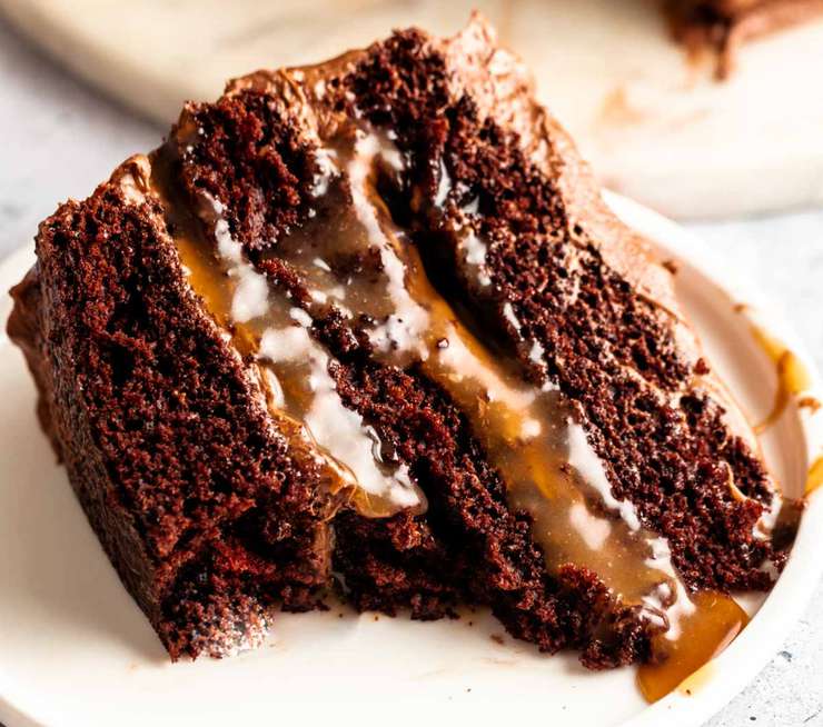 4. Вылейте половину теста в форму, добавьте слой карамели и залейте оставшимся тестом.