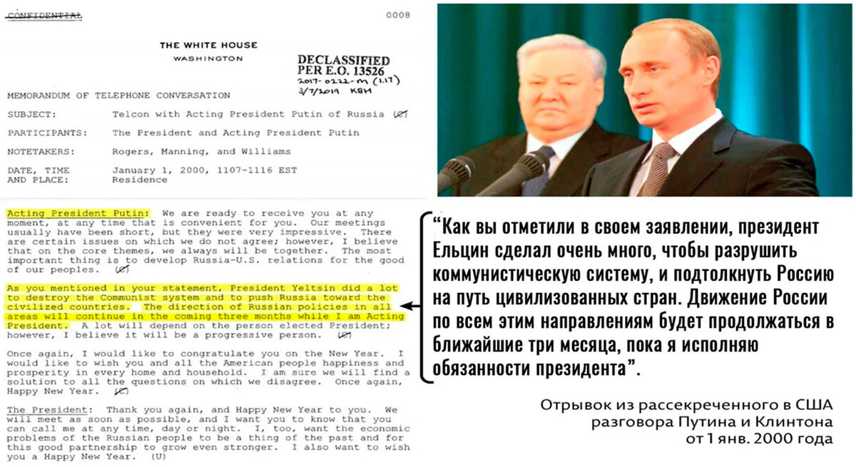 Также известно и то, что Путин общался с Клинтоном по этому и ряду других вопросов. В частности, в январе 2000-го года новый "главный начальник" заверял Клинтона в том, что курс Ельцина в России будет продолжен, Россия будет идти по пути "цивилизованных стран", а возвращения к коммунизму не будет.
