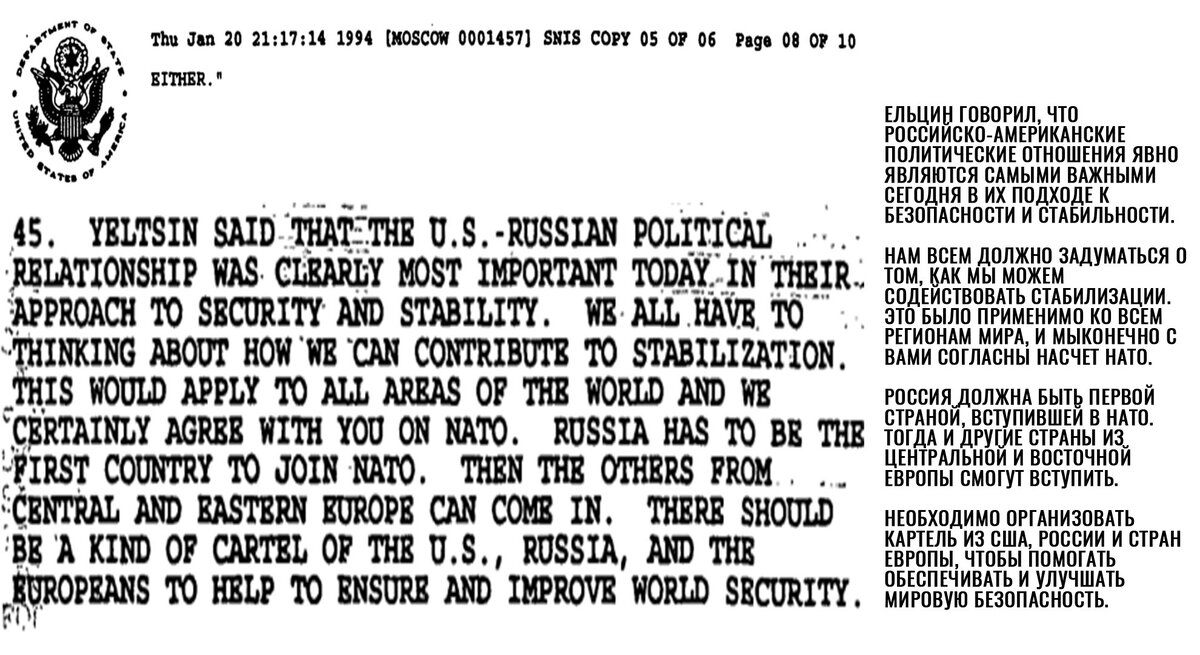В документе отмечается, что такая напористость Ельцина вызвала у тогдашнего президента США Билла Клинтона весьма сдержанную реакцию. Оно и понятно, ведь с окончания Холодной войны прошло всего три года, а фактически вчерашний противник уже рвется в верные союзники и готов принести клятву верности.