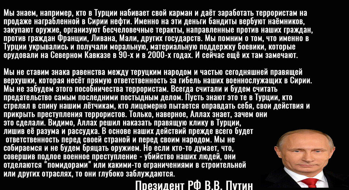 Президент обещал принять самые жесткие меры по отношению к Турции из-за их позиции по Сирии, сбитие российское самолета, помощи различным формированиям и так далее. В общем, турки не должны были "отделаться помидорами". На практике же мы видим, что спустя пару лет политическая конъюнктура изменилась и вторая армия НАТО стала фактически одним из самых важных "дружественных стран" для России.