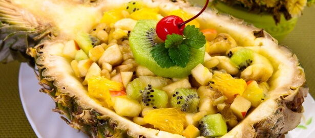 Безусловно, фруктовый салат в ананасе можно подать и в обычной вазе, но согласитесь, что гораздо эффектнее и креативнее будет подать его в половинках ананаса. Это замечательная идея для любого мероприятия, как для детей, так и для взрослых. Салат готовится легко и не потребует от вас много усилий. Попробуйте и приятно удивите своих гостей!