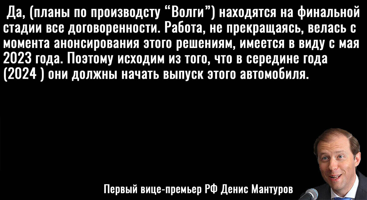 Например, первый вице-премьер Денис Мантуров, который ещё не так давно был министром промышленности и торговли, обещал к лету этого года показать новую версию отечественной "Волги", которая сможет утереть нос своим зарубежным конкурентам.