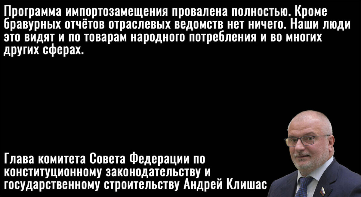 Соответственно, самим "эффективным менеджерам" было бы полезно признать, что их программа импортозамещения на которую были потрачены миллиарды рублей провалилась и сделать из этого определенные выводы. Тем более, уже отдельные сенаторы и другие высокопоставленные лица сами признают этот факт.
