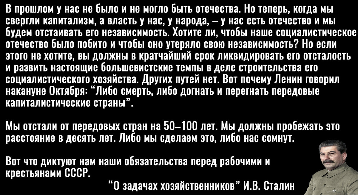 Обещали догнать ведущие капиталистические страны и большевики. Сразу после революции эту цель обозначил Ленин, начав ГОЭЛРО, а Сталин, который считал себя учеником и продолжателем дела Ильича запустил индустриализацию, верно подметив, что без подтягивания до уровня Европы и США СССР просто сомнут.