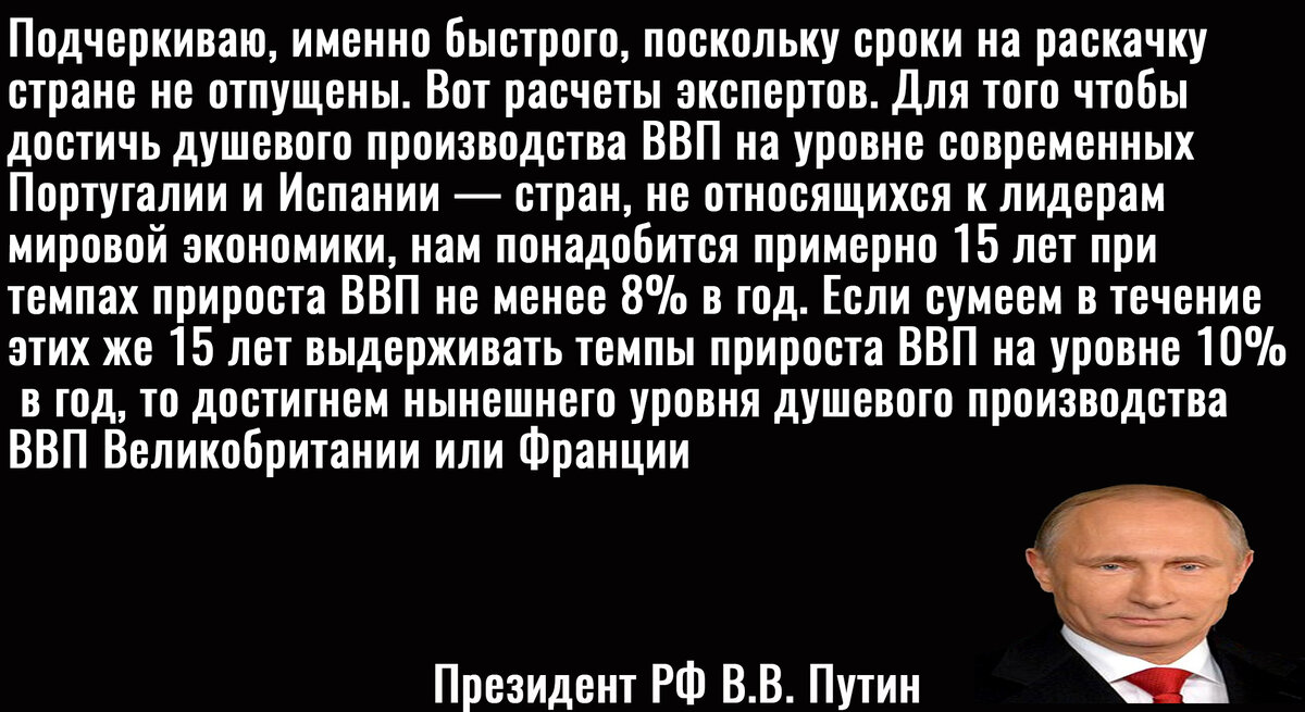 Помимо прочего, важны не только сами цифры, но и тенденции. Социалистический способ хозяйствования доказал свою эффективность на практике, так как при Сталине экономика СССР развивалась в 2,4 раза быстрее, чем у США. Да и после Сталина ВВП рос на несколько процентов в год. При Путине же за последние 15 лет ВВП вырос на 15%, то по 1% в год. При этом среднемировые показатели за тот же период находятся на уровне 3% в год.