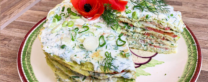 Предлагаю вам приготовить аппетитный и низкокалорийный торт из кабачковых блинов с помидорами и чесноком.