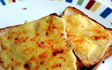 Разместите тосты на противне, смазанном небольшим количеством масла, и запекайте в духовке при температуре 150°C в течение 10 минут, пока сыр не растает. -