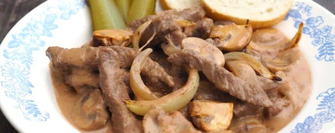 Классический бефстроганов с грибами — это традиционное блюдо, состоящее из говядины и шампиньонов. В сети можно обнаружить множество различных интерпретаций, но истинный, классический бефстроганов — это комбинация всего трех ключевых компонентов: говядины, лука и грибов.