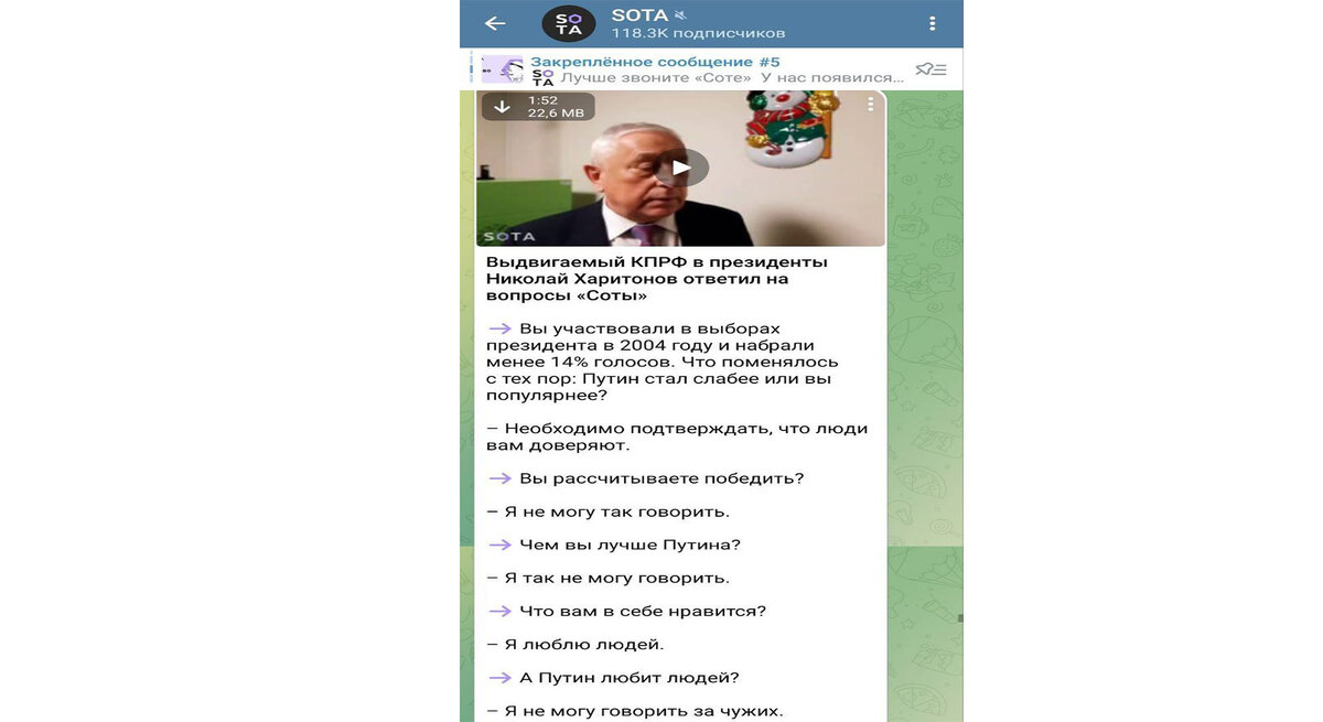 И это даже не преувеличение. Давайте рассмотрим всё это на конкретных примерах. Начнем, например, с кандидата от КПРФ Николая Харитонова, который уже был спарринг-партнером Путина на выборах в 2004 году. Тогда он занял почетное второе место. В интервью изданию SOTA (признана иноагентом) Харитонов отказался говорить чем он лучше действующего президента и собирается ли он побеждать на этих выборах.