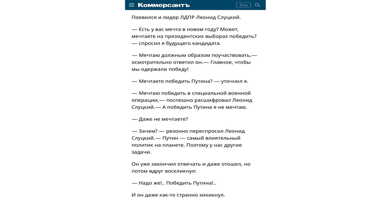 Не отстает от него по уровню лояльности "главному начальнику" и кандидат от ЛДПР Леонид Слуцкий, который является лидером данной партии. На вопросы журналиста "Коммерсанта" о победе выборах Слуцкий попытался уйти от ответа, а потом прямо сказал, что даже и не мечтает победить Путина на выборах.