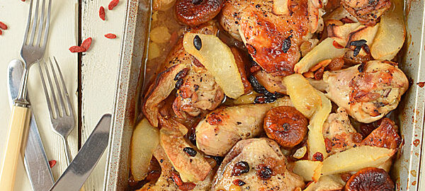 Переложите обжаренные кусочки курицы на противень для запекания. - Сверху выложите фрукты и сухофрукты, залитые сидром, и аккуратно перемешайте. Накройте фольгой, но не плотно, чтобы пар мог выходить. Можно сделать небольшие отверстия в фольге ножом, вилкой или зубочисткой. Поставьте в предварительно разогретую до 140 градусов духовку и запекайте в течение 90 минут. Примерно в середине запекания перемешайте все. После 90 минут снимите фольгу, увеличьте температуру до 180 градусов и продолжайте запекать еще 20-25 минут, пока края фруктов не подрумянятся.