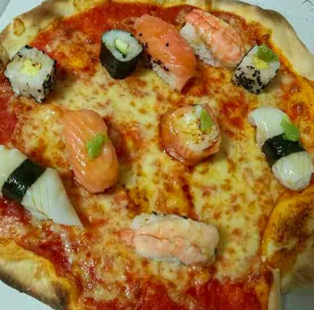 7. А вот здесь суши поместили прямо на пиццу (это, как вы поняли, для тех, кто не может выбрать между суши и пиццой)!
