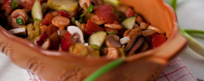 Лук, чеснок и перец чили нарежьте мелкими кусочками. Болгарский перец следует нарезать толстыми полосками, а затем крупными кубиками. Баклажан и кабачки разрежьте вдоль на четыре части, а затем нарежьте кусочками средней толщины. Грибы нарежьте тонкими ломтиками, сосиски — кружочками. Бекон нарежьте полосками.