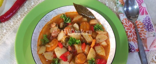 Летний суп с мясом готовится из тех ингредиентов, которые в разгар лета растут на нашем огороде. При желании вы можете варьировать его состав, добавляя различные овощи, такие как капуста, свекла, щавель, помидоры и т.д. Однако не стоит исключать зеленый горошек, болгарский перец и морковь, так как без них вкус будет не таким летним, а все остальное — на ваше усмотрение. Мясо можно использовать любое, которое найдется в морозильной камере.