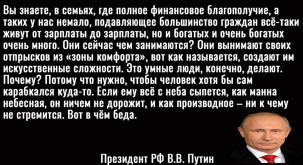При этом, если вы думаете, что именно талантливые люди из простых семей заслуживают поддержки в обществе, то вы ошибаетесь. Президент Путин уже объяснил, что настоящего сострадания заслуживают богачи и их отпрыски, которых приходится вынимать из "зоны комфорта", то есть роскошного образа жизни, чтобы последние не стали мажорами.