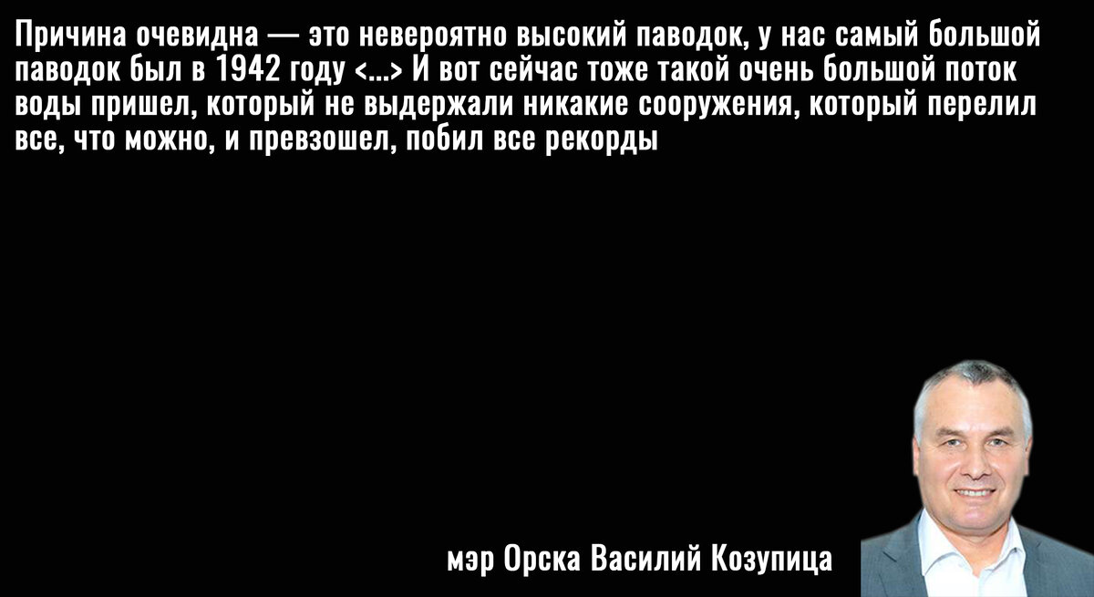 Не менее любопытная версия и у мэра Орска Василия Козупицы. Во всем виноваты не нерадивые управленцы и их бизнес-партнеры, которые кое-как построили дамбу, а затем ненадлежащим образом обслуживали её, а просто силы природы. Козупица обвинил во всем огромный паводок с которым просто было невозможно справиться.