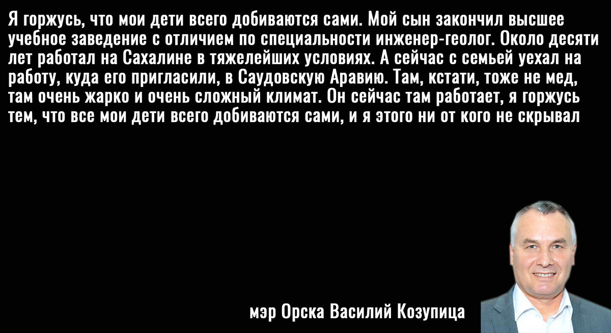 Однако мэр Козупица отрицает, что как-то причастен к переездам своего сына. Василий Николаевич записал целое обращение на этот счет в котором заявил, что его сын просто очень талантливый инженер-геолог, который всегда добивался всего своим трудом. А в арабских странах он находится исключительно по работе. Помимо прочего, мэр Орска посетовал на тяжелую жизнь своего сына, который страдает от местного климата.