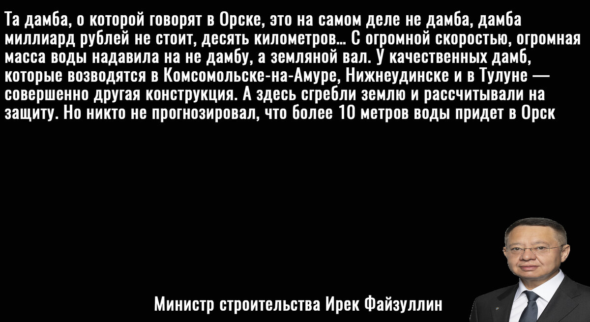 К сожалению для мэра Орска и его бизнес-партнера Комарова, который отвечал за строительство дамбы, с ними не согласен Министр строительства Ирек Файзуллин, который проинспектировал этот город. Высокопоставленный чиновник сказал, что на деньги из бюджета вместо дамбы построили земляной вал, который потом и снесло водой.