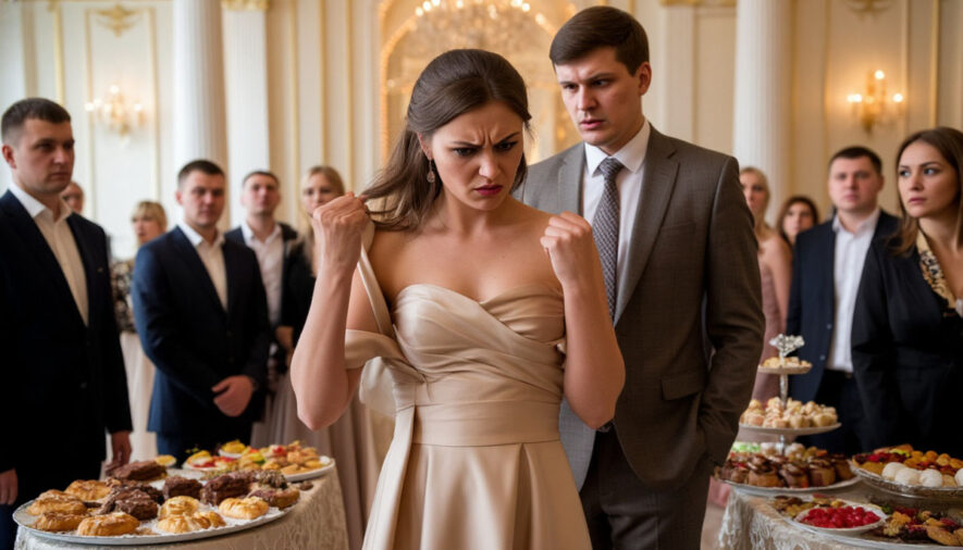 Она сделала шаг в центр зала. Пальцы её потянулись к молнии на спине. Щелчок прозвучал оглушительно в тишине. Затем ещё один. Платье мягко соскользнуло с её плеч и упало на пол к её ногам. Она осталась стоять перед ошеломлёнными гостями в одном лишь нижнем белье.