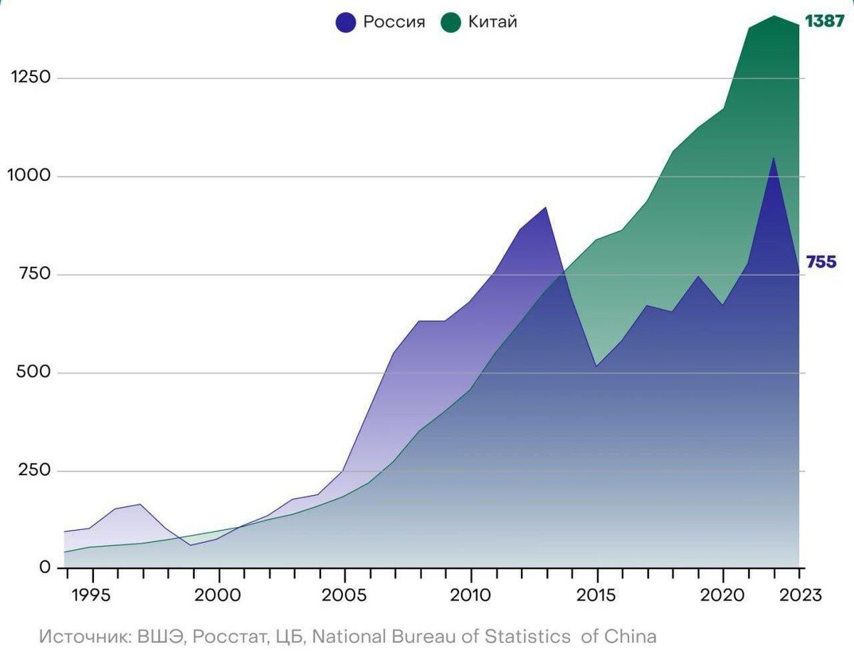 Результаты трех десятилетий десятилетий этого «динамичного развития» можно оценить на графике среднего душевого дохода в долларах США в России и Китае с 1994 года. К 2023 году, как можно видеть из графика, средний китаец в два раза богаче нашего усредненного соотечественника.