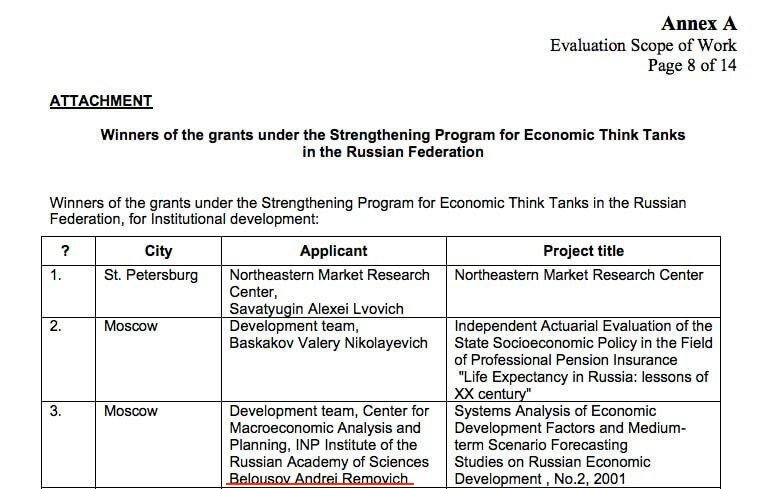 Однако нам Андрей Рэмович интересен не только своей новой должностью, но и любопытными фактами из своей биографии. Например, Белоусов несколько лет подряд получал американский грант от Агентства США по международному развитию (USAID). В свободном доступе довольно легко найти информацию, что с 2001 по 2005 годы Белоусов осваивал американский грант, трудясь в качестве главы Центра макроэкономического анализа. Собственно, сами американцы этого никогда и не скрывали, что видно в соответствующем отчете.