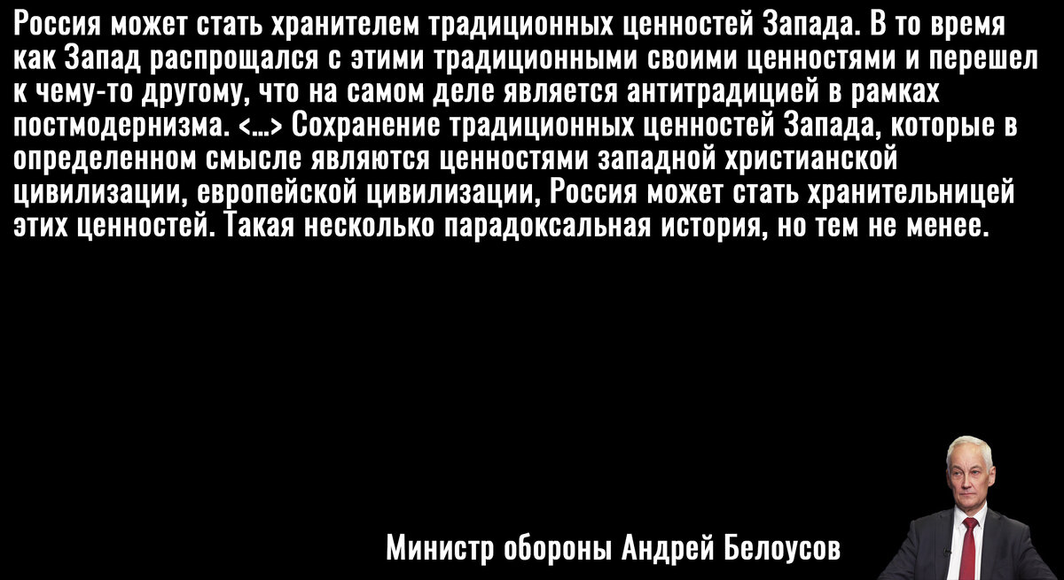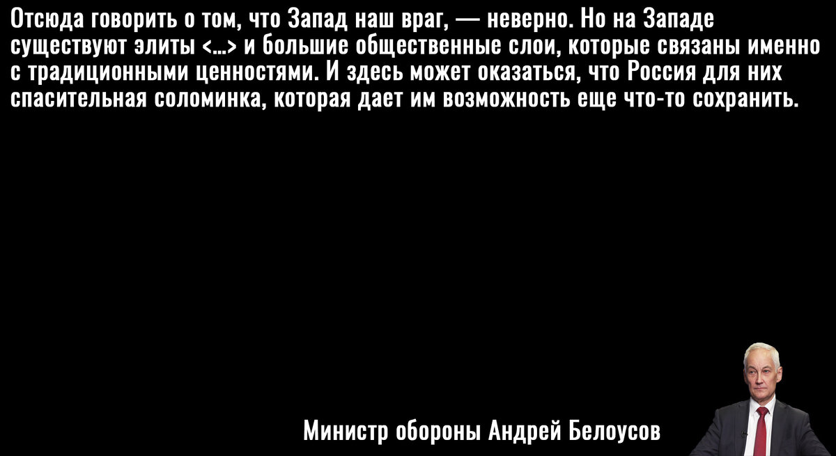 В целом, всё это абсолютно неудивительно, так как кремлевские начальники до сих пор считают себя органичной частью большого Запада. Вот и Белоусов в июне прошлого года заявил, что Россия должна стать цитаделью консерватизма и хранительницей традиционных ценностей Европы. Другими словами, если в Европе заигрывают с либеральными ценностями, то в России начальство изображает из себя консерваторов, но при этом это части одной и той же системы.