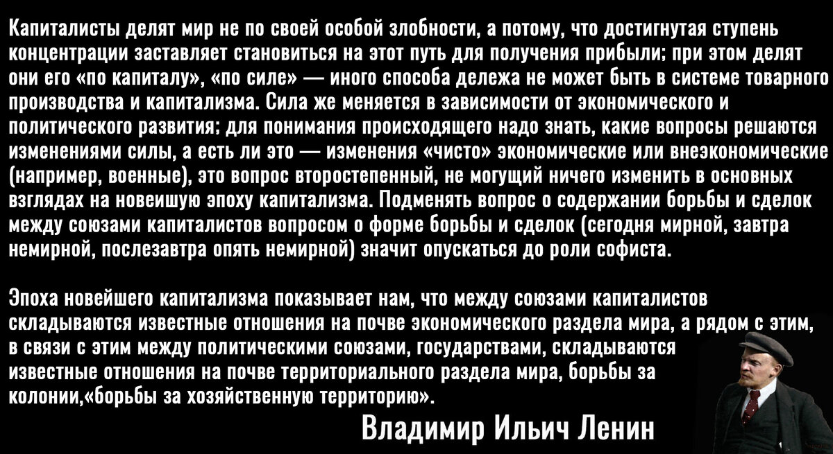 Однако все эти странности уже давно были объяснены в работах Владимира Ильича Ленина. Так, в "Империализме, как высшей стадии капитализма" он отмечал, что для позднего капитализма постоянная перемена "мирной" и "немирной" политики абсолютно естественна, так как империалисты таким образом делят между собой рынки и сферы влияния. Поэтому после очередного передела мира вчерашние враги могут с легкостью стать союзниками и наоборот.