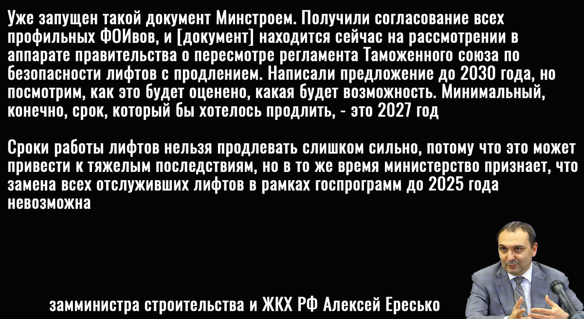 И это совсем не пустые слова. Решение проблемы с лифтами в нашей "индустриальной сверхдержаве" Минстрой нашел не в замене изношенной инфраструктуры, а в ослаблении норм по эксплуатации. Ересько сообщил, что чиновники просто решили на бумаге продлить сроки службы лифтов на несколько лет, так как в России нет мощностей по оперативной замене лифтов.