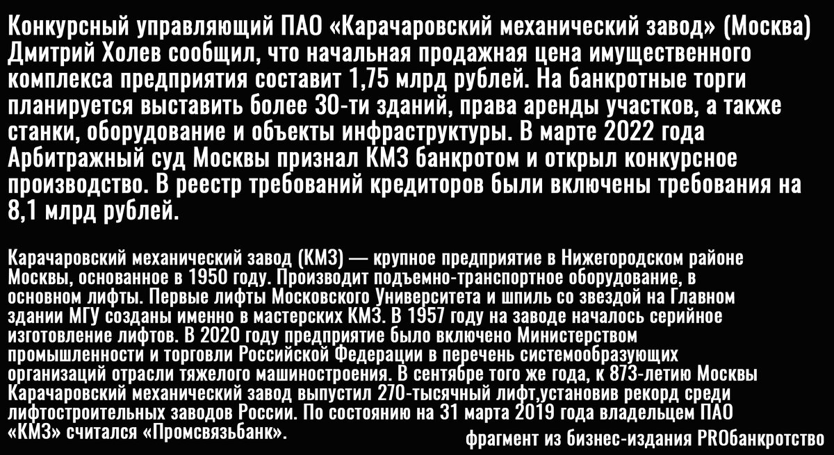 Да, в России еще остались заводы, которые производят лифты, но их мощностей совсем недостаточно. За эти 33 года капитализма многие крупнейшие советские лифтостроительные заводы просто были обанкрочены. Только в 2022 годы были признаны банкротами Карачаровский механический завод (КМЗ) и Лобненский лифтостроительный завод. На КМЗ, к слову, делали подъемники для МГУ, советских космодромов и других важных объектов, но теперь всё это в прошлом.