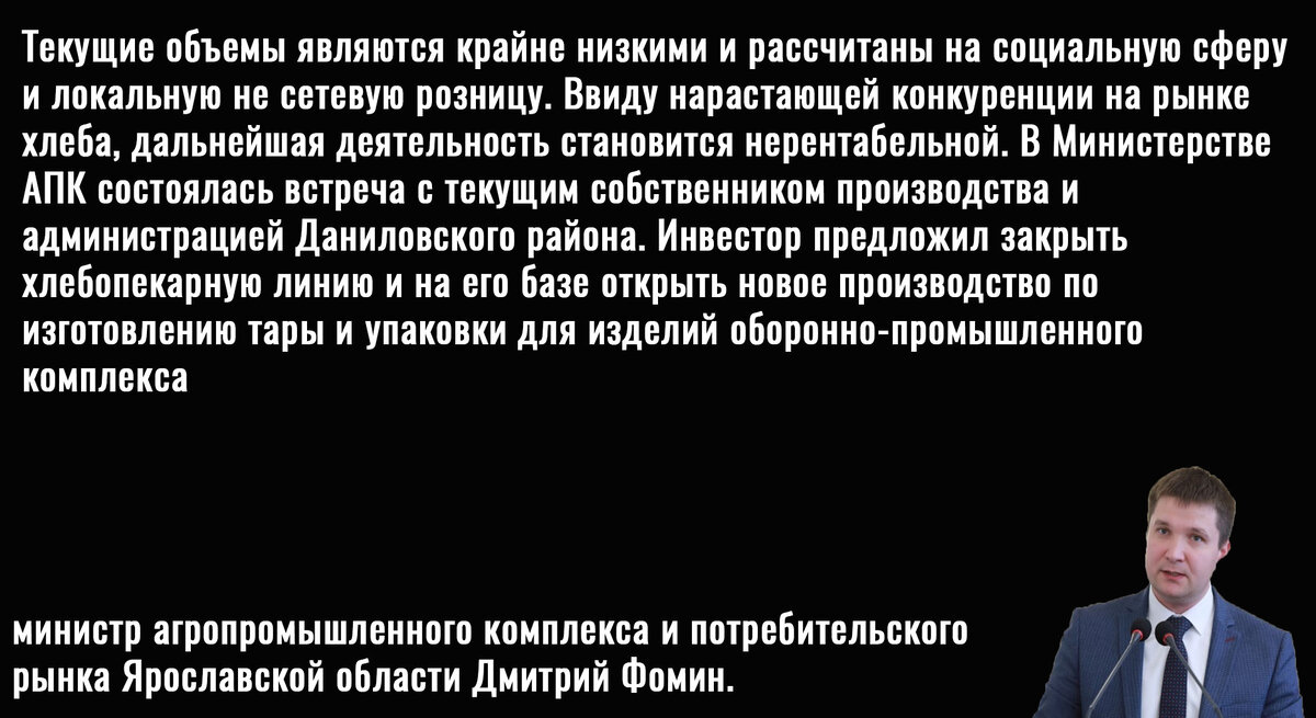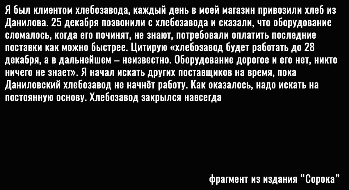 Речь идёт о Даниловском хлебозаводе в Ярославской области история которого насчитывает уже не один десяток лет. Издание "Сорока" получило комментарий местного предпринимателя, который сначала и рассказал, что ему пришлось искать других поставщиков, так как хлебозавод закрылся.