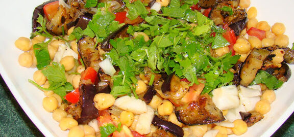 Приготовьте очень аппетитный и необычный салат — нут с баклажанами. Это популярное сочетание продуктов, хотя я была поражена, когда впервые увидела это блюдо. На вкус оно просто великолепно! Ароматное, привлекательное и очень сытное, что тоже важно.
