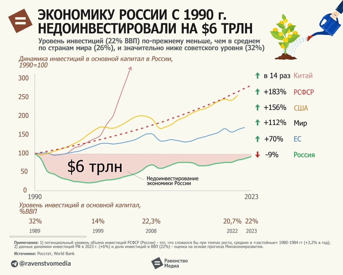 А вот с этим в нашей стране есть определенные проблемы, так как для освоения создания передовых заводов и новых отраслей экономики необходимы систематические инвестиции в основной капитал, а современная Россия, согласно свежим научным данным, с 1990 года недополучила инвестиций в основной капитал на 6 трлн долларов.