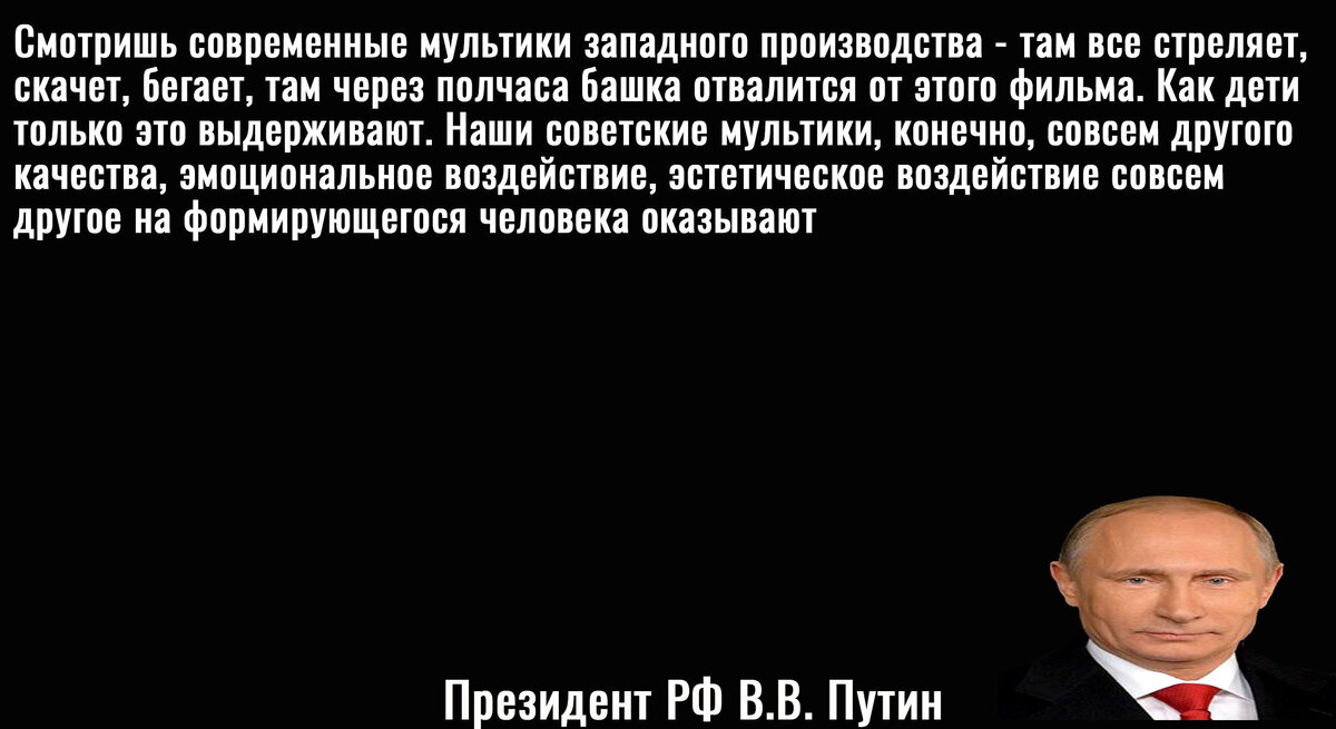 Однако оказывается, что есть ещё одна вещь, которую кроме галош очень неплохо делали в Советском Союзе – это мультфильмы. Действующий президент высоко оценил качество советской анимации, сказав, что она гораздо лучше западных аналогов, так как формирует эстетические и культурные установки более высокого уровня.