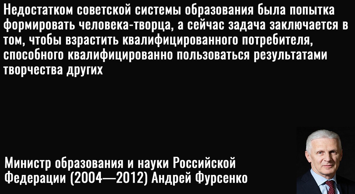 При капитализме же, что в России, что в других странах пествуется не саморазвитие личности, а увеличение потребления. Именно поэтому к мультику про Бэтмена или Человека-паука есть огромное количество игрушек и прочей связанной с этими персонажами продукции, которую необходимо купить. В нашей стране, к слову, на уровне министра образования заявлялось, что государству нужно растить именно вот таких "грамотных потребителей" и никакие творцы никому не нужны.