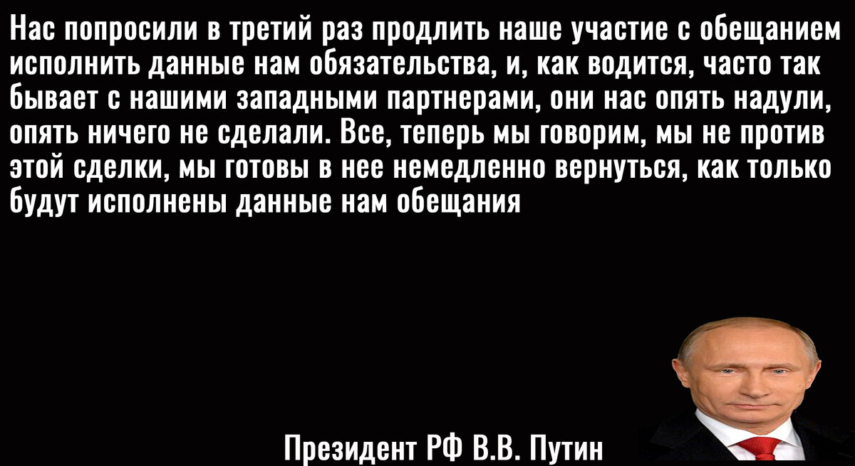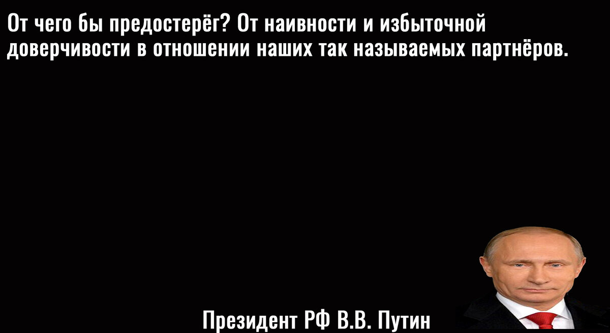 Безусловно, эти "партнеры" способны пойти на ложь и прямой обман, чтобы достичь каких-то своих целей, но после одного-двух таких случаев даже самый обычный человек стал бы держать уши в остро и не доверять таким "партнерам", не говоря уже о людях, которые прошли специальную подготовку в советской школе КГБ. Путин же рассказывал о недобросовестности американцев и европейцев очень много раз.