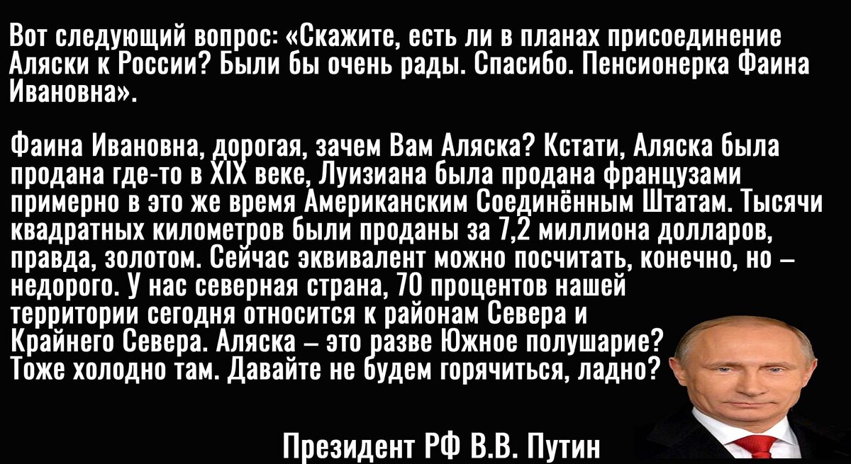 Однако ничего подобного не происходит. Никаких реваншистских настроений в сторону, например, Америки от президента никогда замечено не было. Напротив, на «Прямой линии» в 2014 году «главный начальник» старался умиротворить некоторые горячие головы среди наших сограждан, требующих вернуть Аляску.