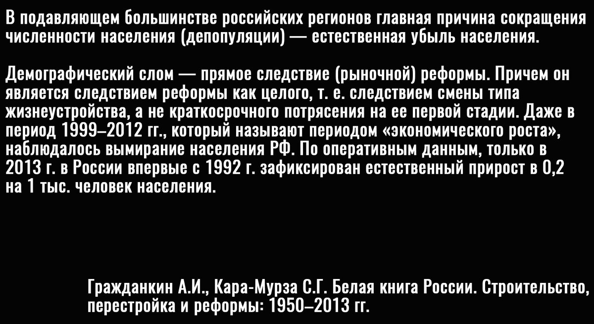 Подводя итог, в сухом остатке мы имеем тот факт, что капитализм без всякого преувеличения убивает наш народ, сокращая его количество год от года. Управленцы же делают вид, что не замечают последствий рыночных реформ и продолжают рассказывать о том, что нужно строить многодетные семьи. Таким образом, перед нашим обществом встает вполне конкретный выбор, который был обозначен еще Розой Люксембург: социализм или варварство.