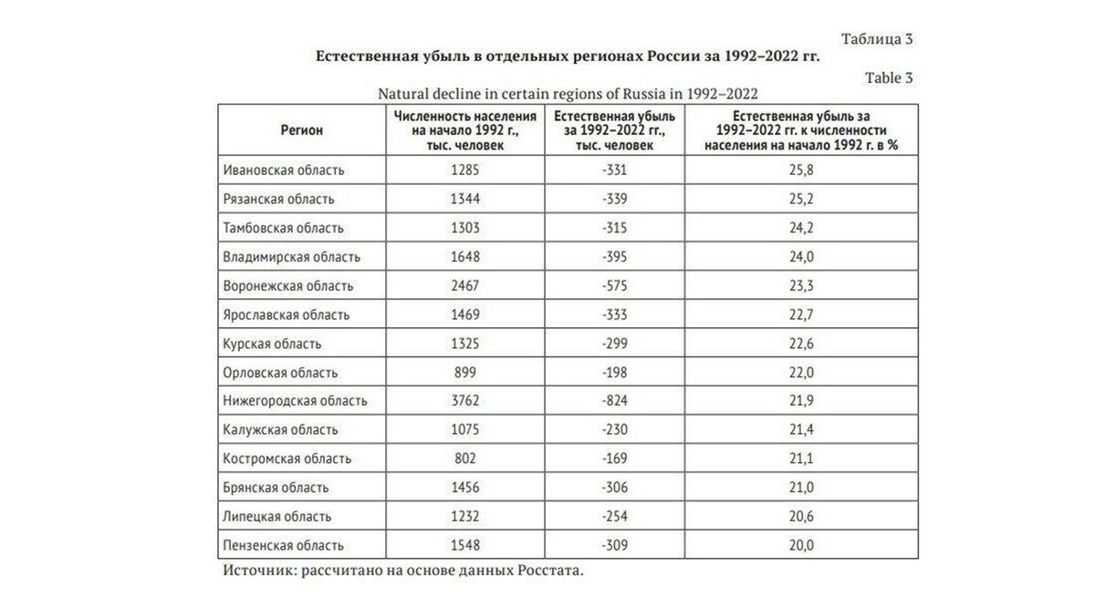 Только по официальным данным демографов из Росстата за 30 лет капитализма население областей центральной России сократилось от 20% до 25%. Под руководством "эффективных менеджеров" население Тамбовщины сократилось на 315 тысяч человек, а в Воронежской области стало меньше почти на 600 тысяч жителей. Всего же за эти годы в представленных ниже регионах общая убыль составила 4,8 миллиона человек.