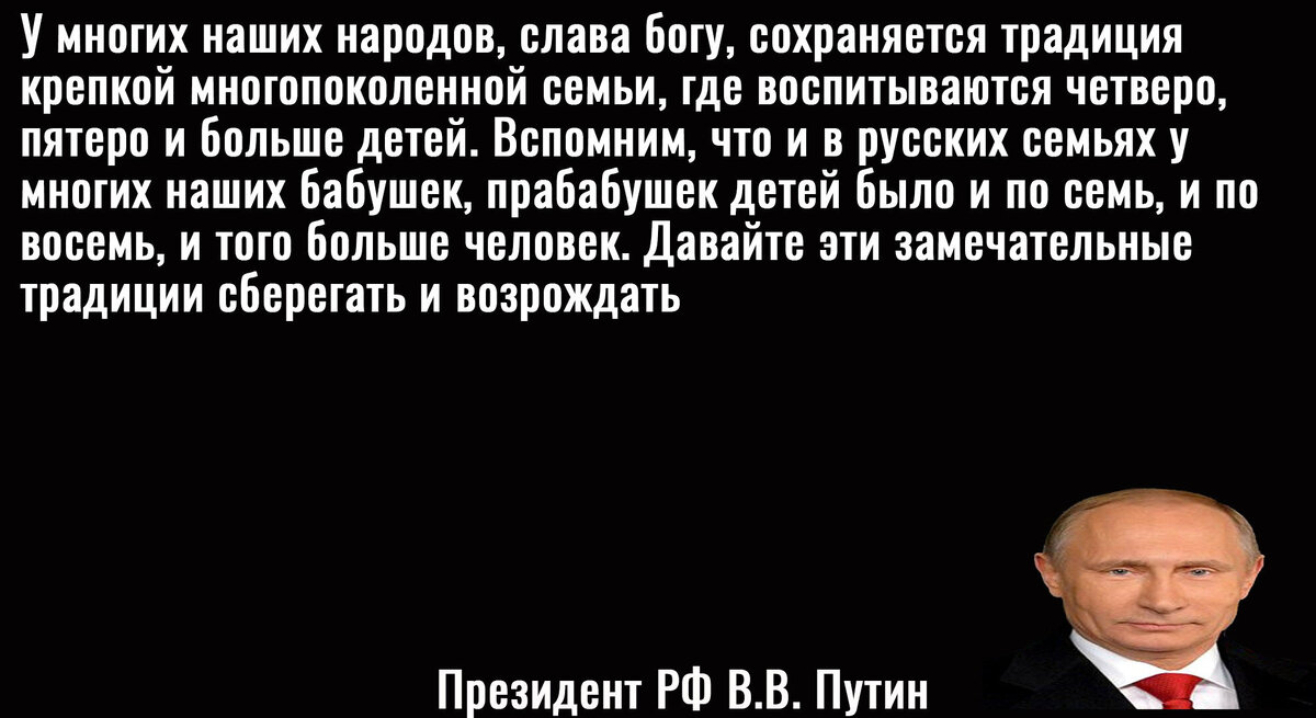 Несмотря на всё это, руководство нашей страны до сих прибывает в каких-то странных маниловских мечтах о возрождении крестьянской России, когда в семьях было по 7-8 детей. Некоторое время назад Путин призвал возродить эти традиции славной старины. "Главный начальник", видимо, запамятовал, что большинство россиян – это городские жители, а не крестьяне и с времен царской России очень многое изменилось.
